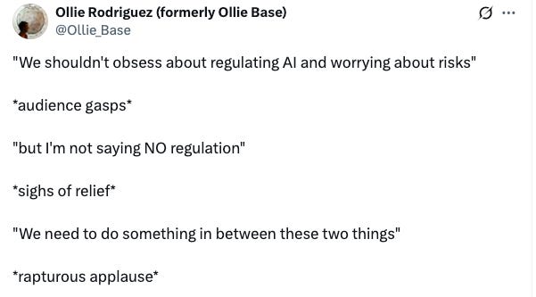 I found it hard to follow Hoffman’s views on what kind of regulatory infrastructure he thinks might be appropriate for AI. The below tweet, I can now reveal, was a jab at Hoffman, specifically this video from one of Hoffman’s lectures.